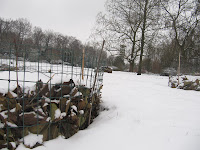 Mamoetblad wel te verstaan. Niet het wolharige gevaarte dat je zo vaak op schoolprenten afgeslacht ziet worden door hongerige oermensen in berenvel, maar een reuzerabarber afkomstig uit Brazilië en Chili. Dit mamoetblad (Gunnera manicata) komt van oorsprong voor in bergmoerassen in Brazilië en is in Nederland als tuinplant ingevoerd als versiering van vijvers. De plant is weliswaar bestand tegen temperaturen van -20 C ˚ maar wordt wel graag voor de winter toegedekt. Zoals te zien is word dit gedaan met behulp van bladafval dat in de omliggende demonstratietuin is verzameld. In tegenstelling tot zijn wolharige naamgenoot is deze plant dus alleen winterhard met wat bescherming.