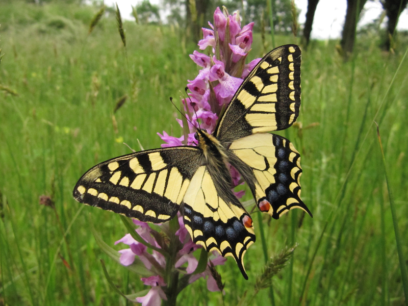 Van alle mooie dingen die je kunt tegenkomen op Landgoed Larenstein hoort de koninginnenpage toch zeker wel bij de top 10! Toen Jill, een van de conciƫrges, dan ook vertelde dat er een grote geel met zwarte vlinder in de tuin zat, zijn we meteen naar buiten gegaan om te kijken of hij er nog zat. En ja hoor, daar zat een prachtige koninginnenpage (Papilio machaon) rustig te genieten op een orchidee in het blauwgraslandje. Het zonnetje scheen niet en het was niet erg warm, dus zij was erg kalm en liet zich goed fotograferen. Deze dagvlinder, een van de grootste van Nederland, was op het landgoed pas 1 keer eerder waargenomen in 2006, dus dat is altijd extra leuk!