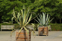 De planten die voor de school staan zijn allebei van de zelfde soort, hoewel je dat op uiterlijk niet zou zeggen. De honderdjarige aloë (Agave americana) heeft een grijze en een geelgerande variant . Beide zijn oorspronkelijk afkomstig uit Mexico en zijn inmiddels in veel landen over de hele wereld als sierplant ingevoerd. Hoewel deze plant de honderdjarige aloë heet heeft ze niet de zelfde helende werking als de Aloë vera (Aloe vera). Waar het sap van de aloë vera zacht en verzorgend voor je huid is, veroorzaakt het sap van de honderdjarige aloë direct na contact een ernstige huidirritatie die dagenlang kan aanhouden. Niet echt iets voor je shampoo dus.